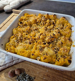 8. Dans un plat allant au four, mélanger les pâtes, la sauce et les noisettes. Ajouter le fromage râpé.